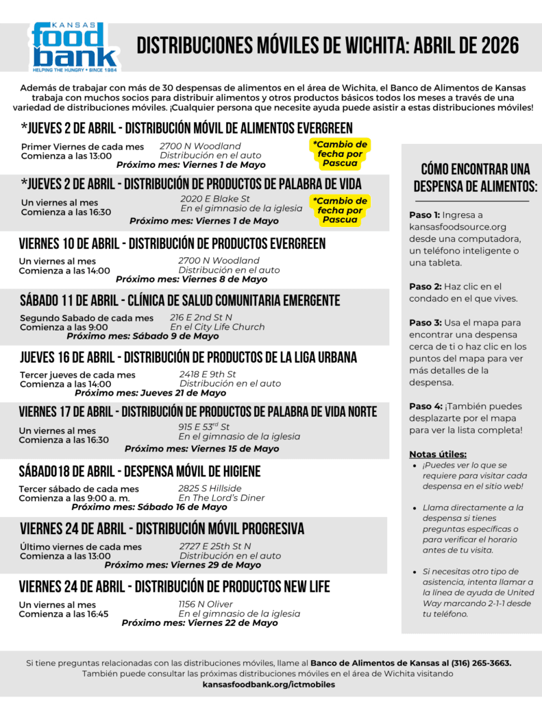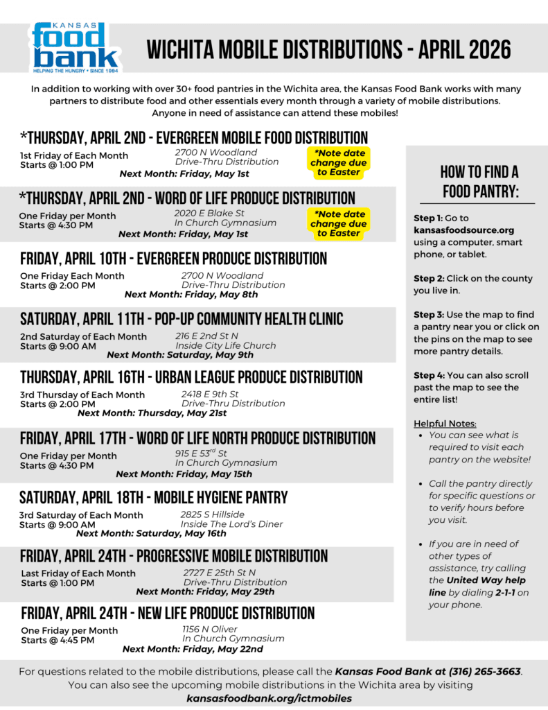 If you have any questions about the upcoming distributions, please call the Kansas Food Bank at (316) 265-3663.