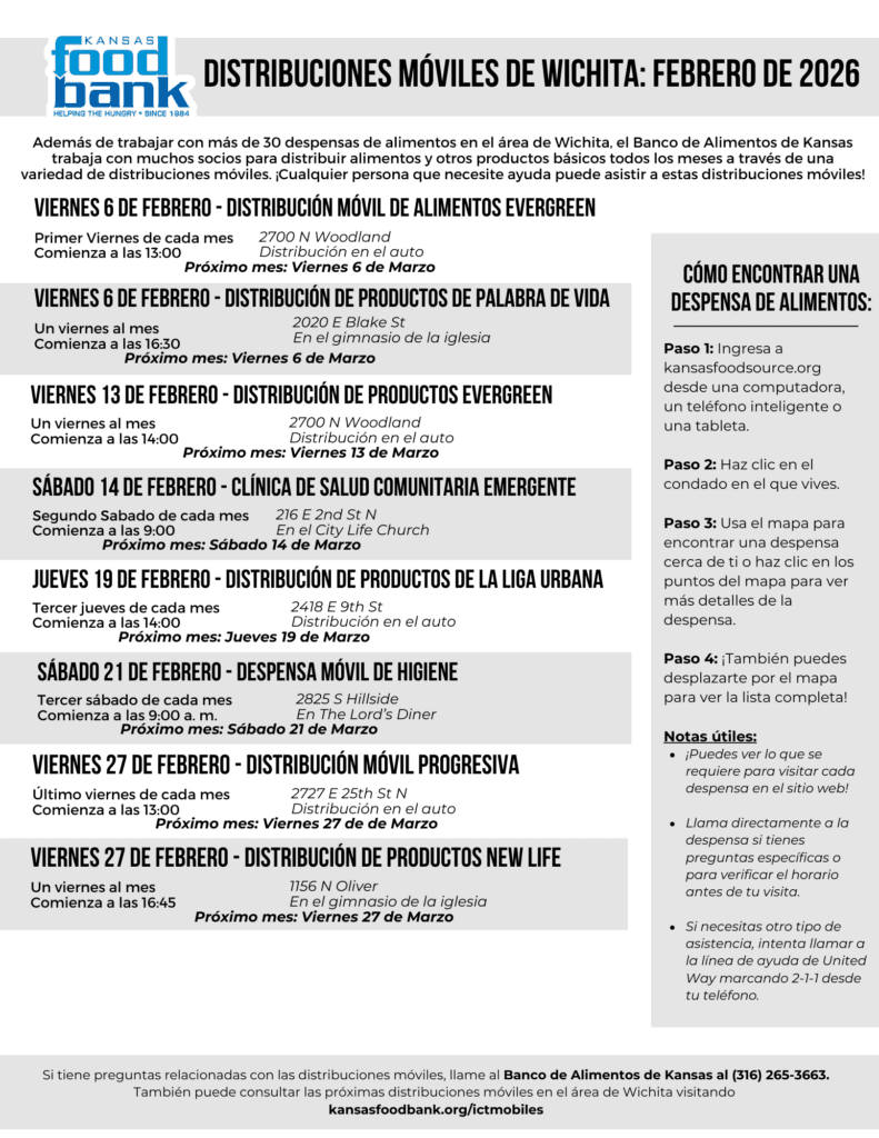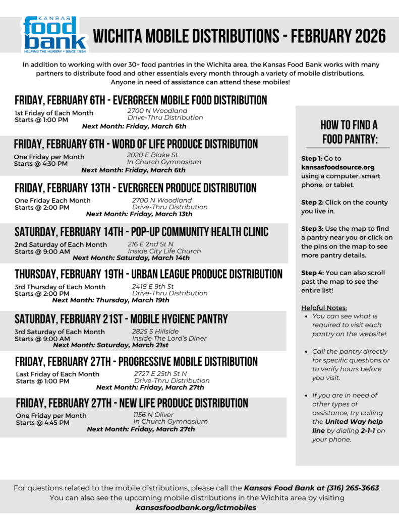 If you have any questions about the upcoming distributions, please call the Kansas Food Bank at (316) 265-3663.