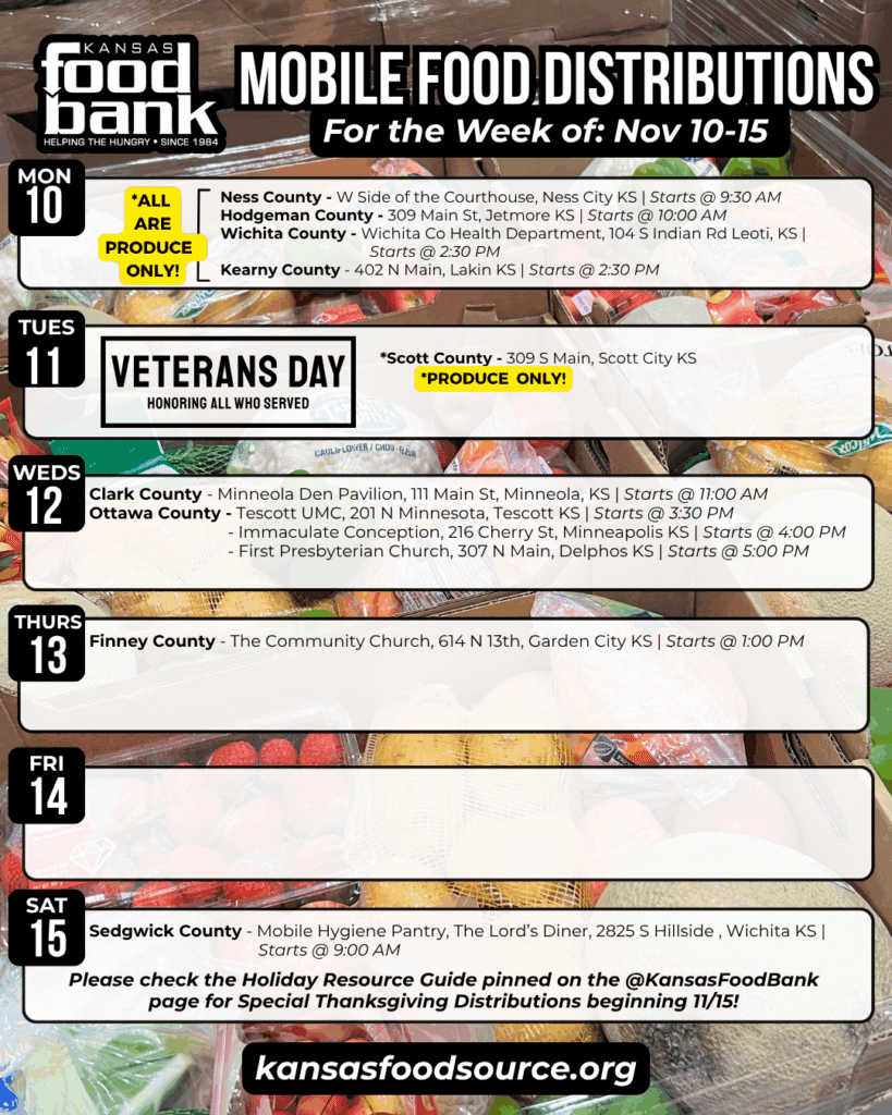 Please note: Many of this week’s mobile distributions have been moved up to Monday, November 10th due to Veterans Day. The Kansas Food Bank WILL be open on Tuesday, November 11th.